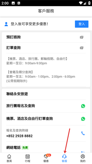 4、客服頁面提供預訂咨詢訂單查詢等服務,標注服務時間與聯系方式,是解決旅行相關問題的支持界面。