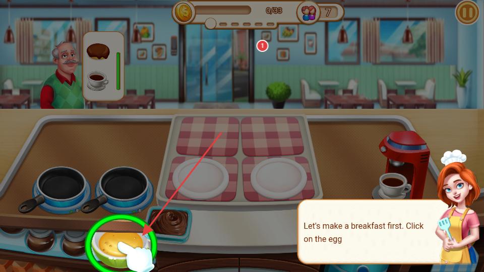 1、進入游戲看到制作美食的提示,首先點擊裝有雞蛋的容器,獲取雞蛋食材,為后續制作美食做準備。