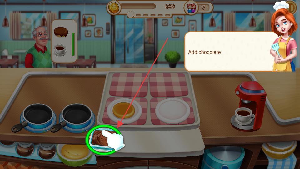 3、美食放到盤子里后,根據提示,點擊巧克力醬,將巧克力醬添加到盤子里的美食上,為美食增添風味。
