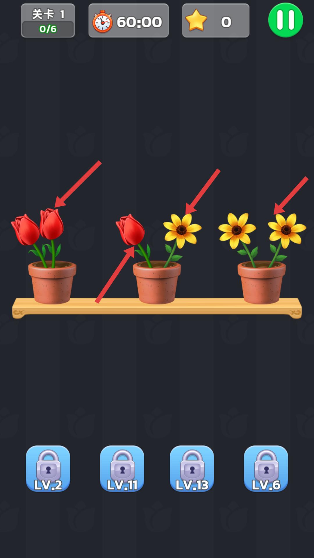 1、關卡1需在60分鐘內,將相同種類花朵歸置到同一花盆,湊齊6朵花即可通關,開始時可先觀察花朵種類進行歸類操作。