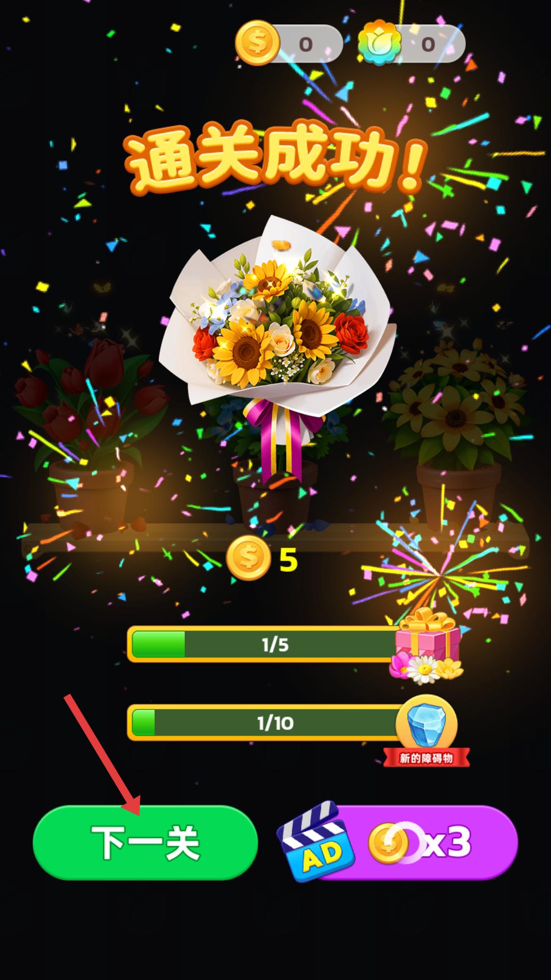 3、資源管理系統:通過合理分配每日免費道具與廣告獎勵,優先升級常用道具效果。花卉能量槽滿后可手動觸發全屏刷新功能。