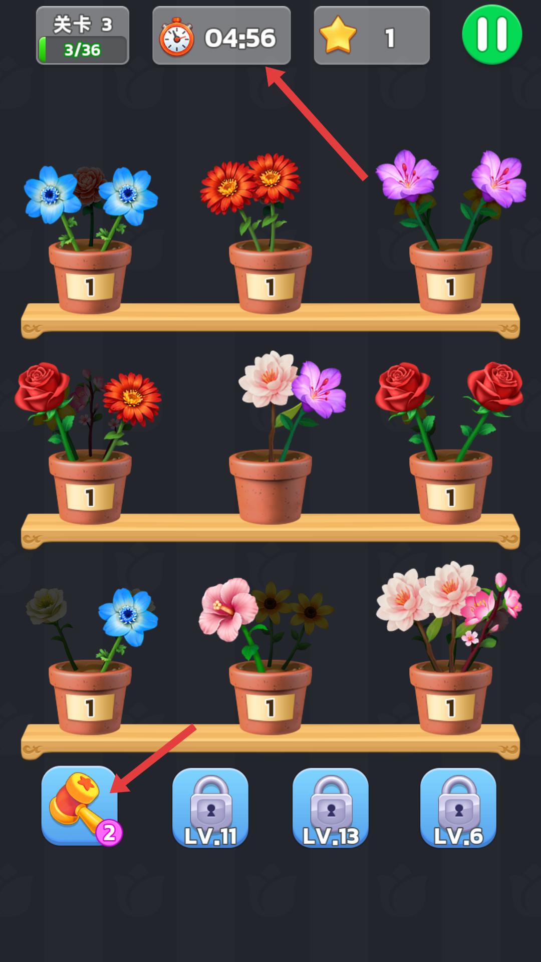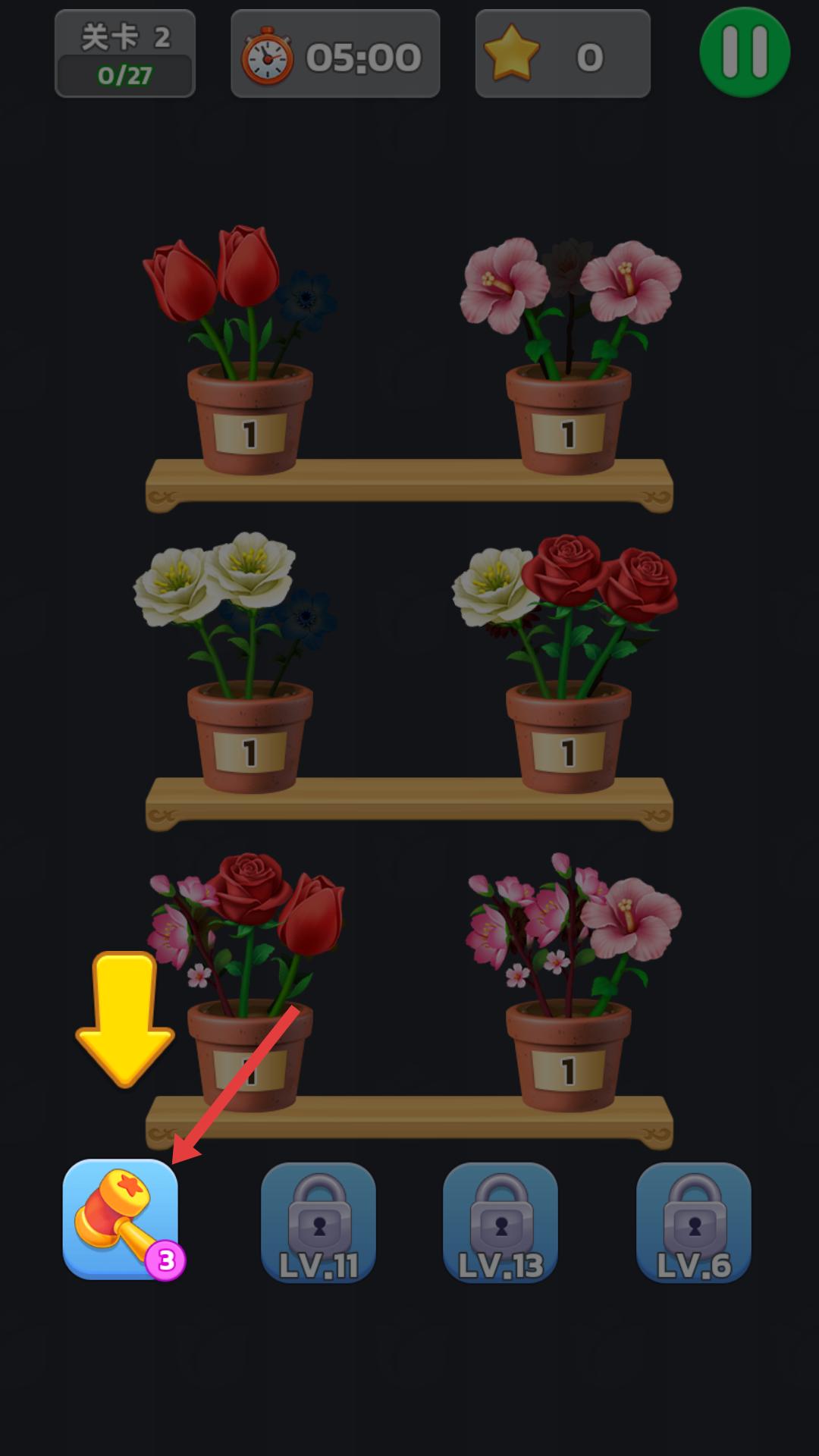 3、關卡2有時間限制,且花盆數量增加,下方有錘子道具,可利用錘子清理多余花朵,幫助更快整理相同花朵,朝著湊齊27朵花的目標推進。
