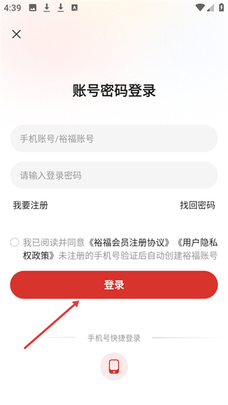 1、登錄頁支持賬號密碼登錄和手機號快捷登錄,需輸入賬號、密碼并勾選用戶協議后可登錄,全方位助力用戶進入裕福商城平臺。