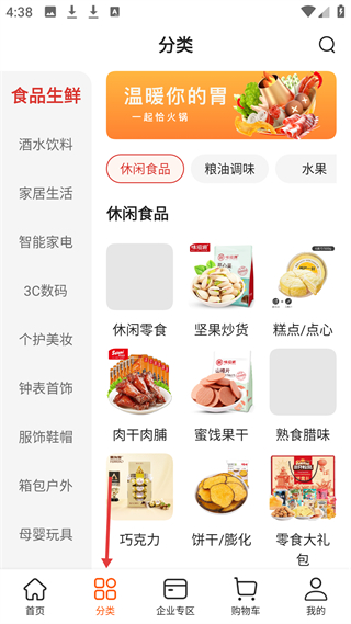 3、分類頁有食品生鮮、酒水飲料等多類入口,涵蓋休閑食品、糧油調味等品類,方便用戶按類別查看和選購商品。