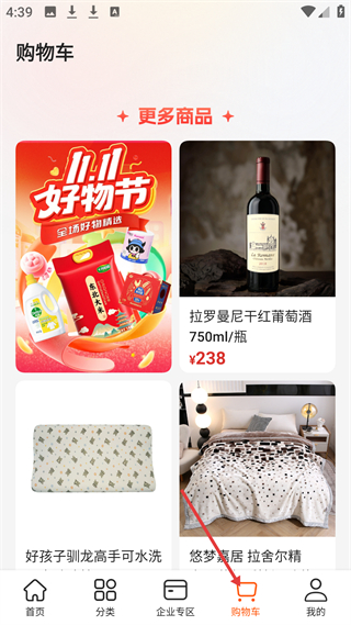 4、購物車頁展示多款商品,有葡萄酒、床上用品等,方便用戶查看和管理選購的商品。