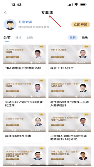 2、專業課按關節等分類,有VIP課程,涵蓋TKA術中參考選擇等內容,講師為骨科專家,助力提升關節外科診療技術。