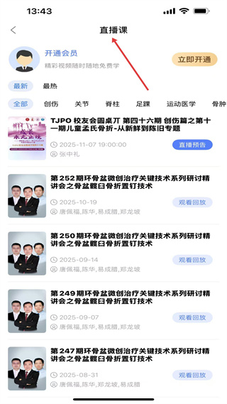 4、直播課按分類展示,有兒童孟氏骨折直播預告及多期環骨盆微創治療研討回放,助力醫師及時學習骨科前沿技術。