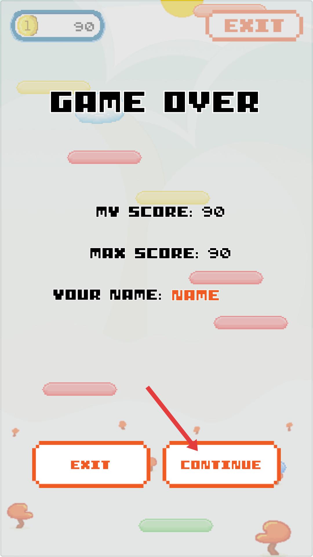 4、游戲結束界面顯示得分等信息,若想繼續游戲,點擊CONTINUE按鈕,重新開始挑戰。