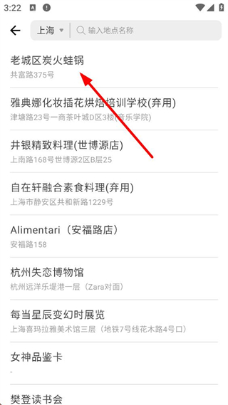 4、添加地點時可選擇城市,輸入地點名稱后會顯示相關地點列表,如老城區炭火蛙鍋等,選擇對應地點可讓內容關聯具體位置。