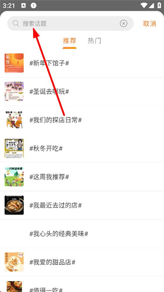 3、參與話題時可通過搜索欄查找話題,頁面也會推薦熱門話題如新年下館子等,選擇對應話題能增加內容的曝光度與互動性。