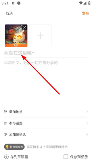 2、進入發布頁面后,需上傳封面填寫標題與正文,還能添加地點參與話題或附上悄悄話,填寫完成后可選擇發布或存到草稿箱。