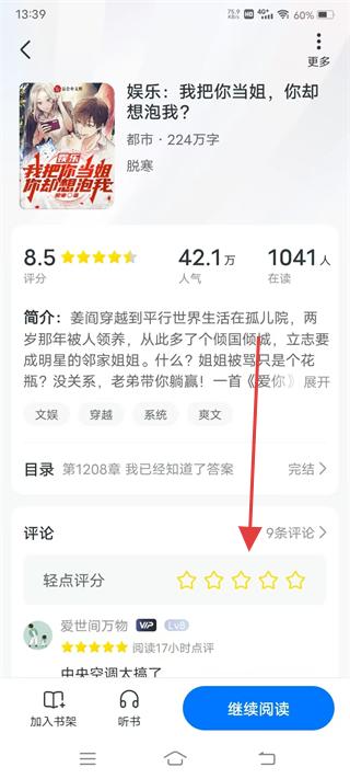 2、進入小說詳情頁點擊輕點評分,參與對評分,表達對小說的評價,同時可查看其他讀者的評論,提升閱讀互動體驗。