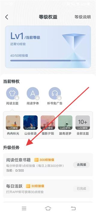 1、進入軟件等級權益頁面,查看當前等級Lv1及還需經驗值,了解閱讀主題、閱讀字體等當前特權,同時可查看升級任務。