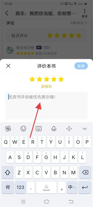 3、在評價本書頁面輸入對小說的優質書評點擊發表,分享自己的閱讀感受,同時可選擇星級評分,全面參與小說評價互動。