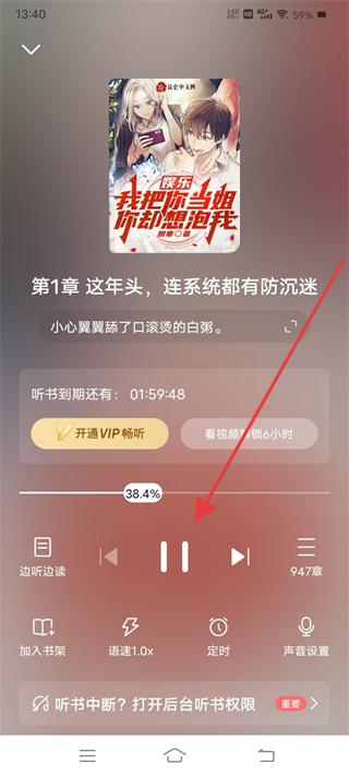 4、進入聽書頁面點擊播放按鈕開始聽書,查看聽書進度與剩余時間,同時可調整語速、定時等設置,開啟聽書模式,提升閱讀的便利性與多樣性。
