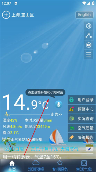 2、在寶山區氣象界面,查看當前溫度濕度等實時數據,點擊語音按鈕可開啟知識對話,還能瀏覽天氣趨勢及當日氣象采集信息。