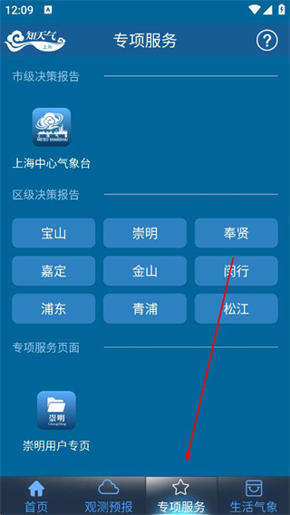 4、切換至專項服務頁面,查看市級決策報告,選擇對應區級選項,還能進入專項服務頁面,查看如崇明用戶專頁等專屬服務內容。