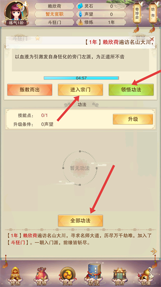 4、可加入宗門如斗狂門,進入宗門后領悟功法,查看全部功法,提升技能點,升級功法增強實力。
