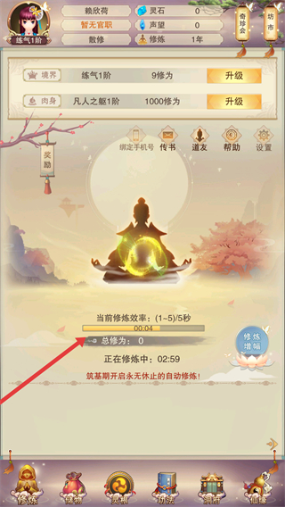 1、可進行修煉,提升境界和肉身等級,積累修為,筑基期開啟自動修煉,持續提升戰力。