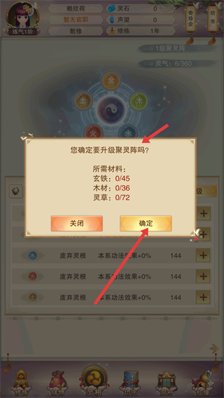 3、可升級聚靈陣,消耗玄鐵、木材、靈草等材料,提升聚靈陣等級,增加靈氣獲取效率。