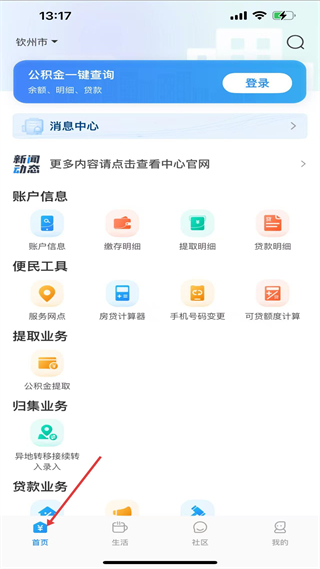 1、首頁,提供公積金查詢、賬戶信息等功能入口,含便民工具與業務板塊,是辦理公積金業務的核心界面。