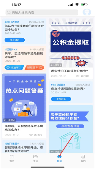3、社區頁面,呈現熱門話題與公積金小課堂內容,支持話題參與與知識學習,提供互動交流與資訊獲取渠道。