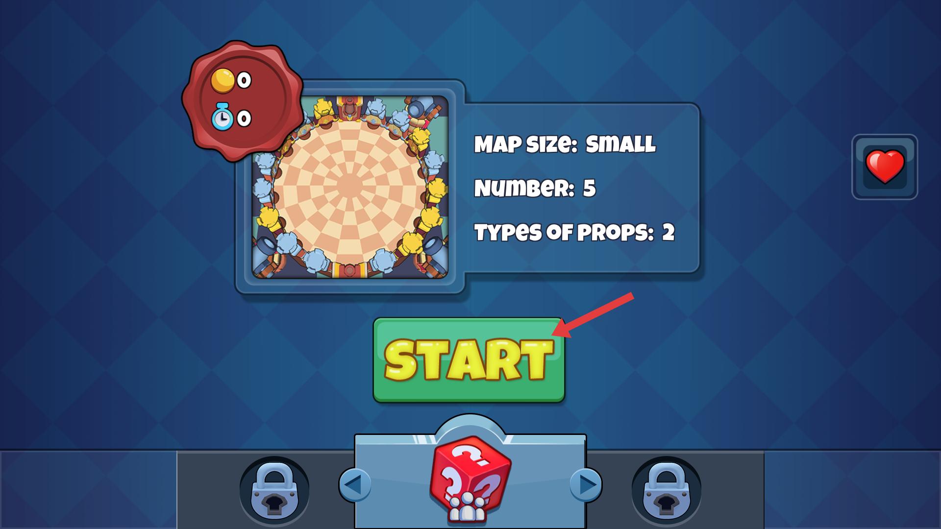 1、游戲開始前界面會顯示地圖大小、參與數量和道具類型等信息,確認后點擊START按鈕即可進入游戲。