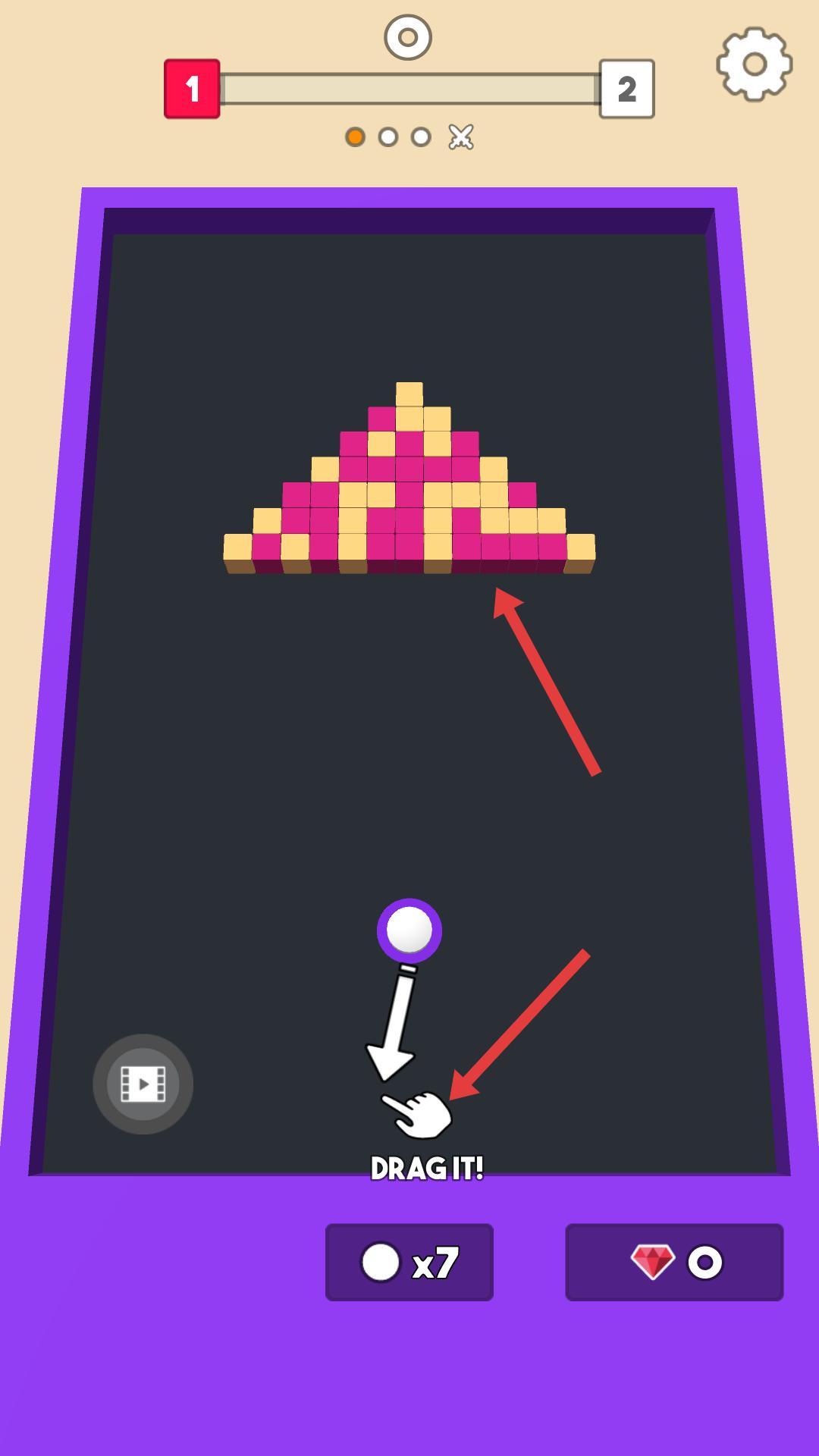 2、進入關卡后按照提示拖動發射裝置,調整角度向像素塊發射,擊碎像素塊,推進游戲進程。