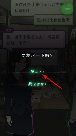 2、面對紫乃的復習提議,選擇對應的選項回應,比如選擇拜托了來開啟復習,推進角色間的互動流程。