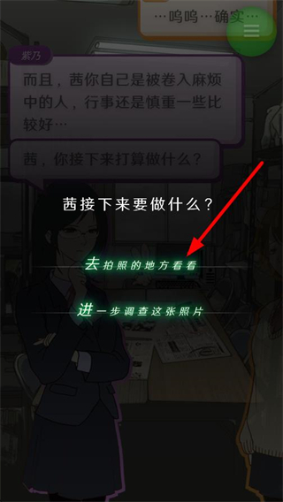 3、在紫乃的詢問下,從選項里選擇茜接下來的行動方向,比如選擇去拍照的地方看看,確定后續的調查路線。
