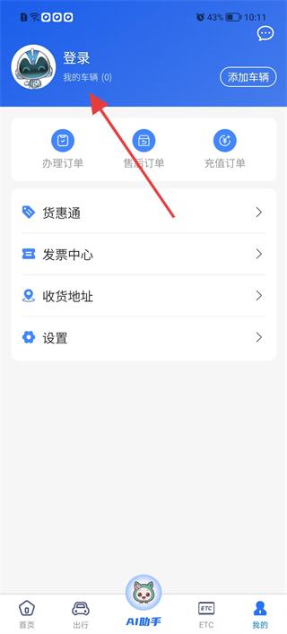 4、進入我的頁面點擊登錄,管理辦理訂單、售后訂單等,添加車輛信息,設置收貨地址等,同時查看貨惠通、發票中心等服務,全面管理賬戶與業務,提升使用體驗。