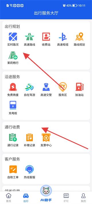 2、點擊出行進入出行服務大廳,查看實時路況、高速路線等出行規劃功能,以及免費救援、自駕游等沿途服務,規劃高速出行行程。