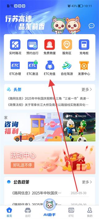 1、首頁布局豐富,聚合ETC辦理、激活、充值等功能,還可查詢賬單、消費明細,附近網點信息與活動中心同步呈現,為江蘇車主打造便捷出行服務。