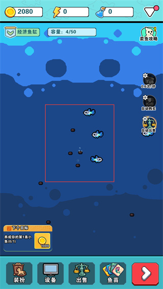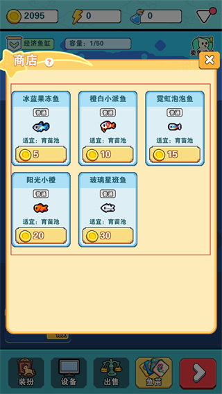 2、點擊界面下方的商店按鈕,進入商店后選擇魚苗選項,花費游戲內的金幣購買喜歡的魚苗,將魚苗放入魚缸中開始養殖。