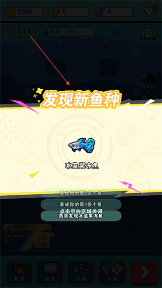 4、在不斷購買、養殖和繁殖魚兒的過程中有機會發現新的魚種,會有提示彈窗豐富自己的魚類圖鑒,增加游戲的收集樂趣。