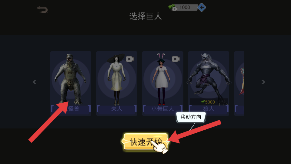 2、在選擇巨人界面,能看到多種巨人形象,比如怪獸、夫人等,選擇其中一個巨人后,點擊快速開始,就能進入巨人相關的游戲環節。