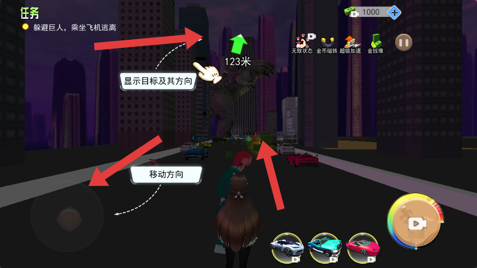 3、進入游戲場景,任務是躲避巨人并乘坐飛機逃離,可通過移動方向來控制角色移動,同時界面會顯示目標及其方向,助力逃生。