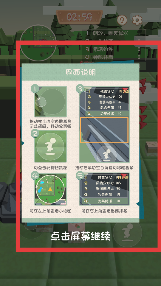 1、點擊開始游戲,進入游戲,查看界面說明,了解移動、跳躍等操作方式,熟悉小地圖和排名查看方法。