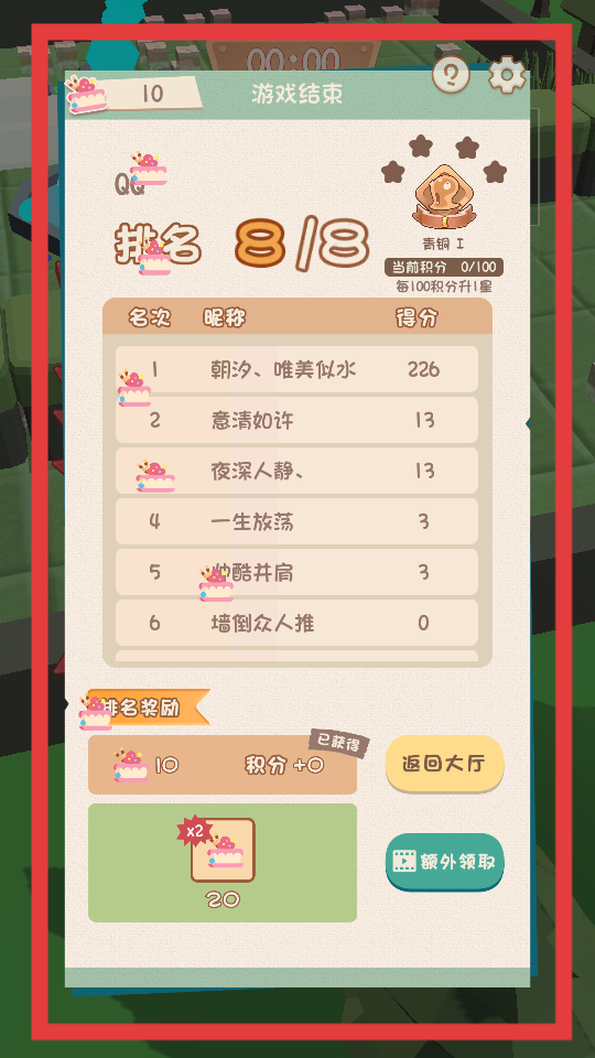4、游戲結束后,查看最終排名和獎勵,可選擇返回大廳,準備開始下一局游戲,繼續挑戰獲取更好成績。