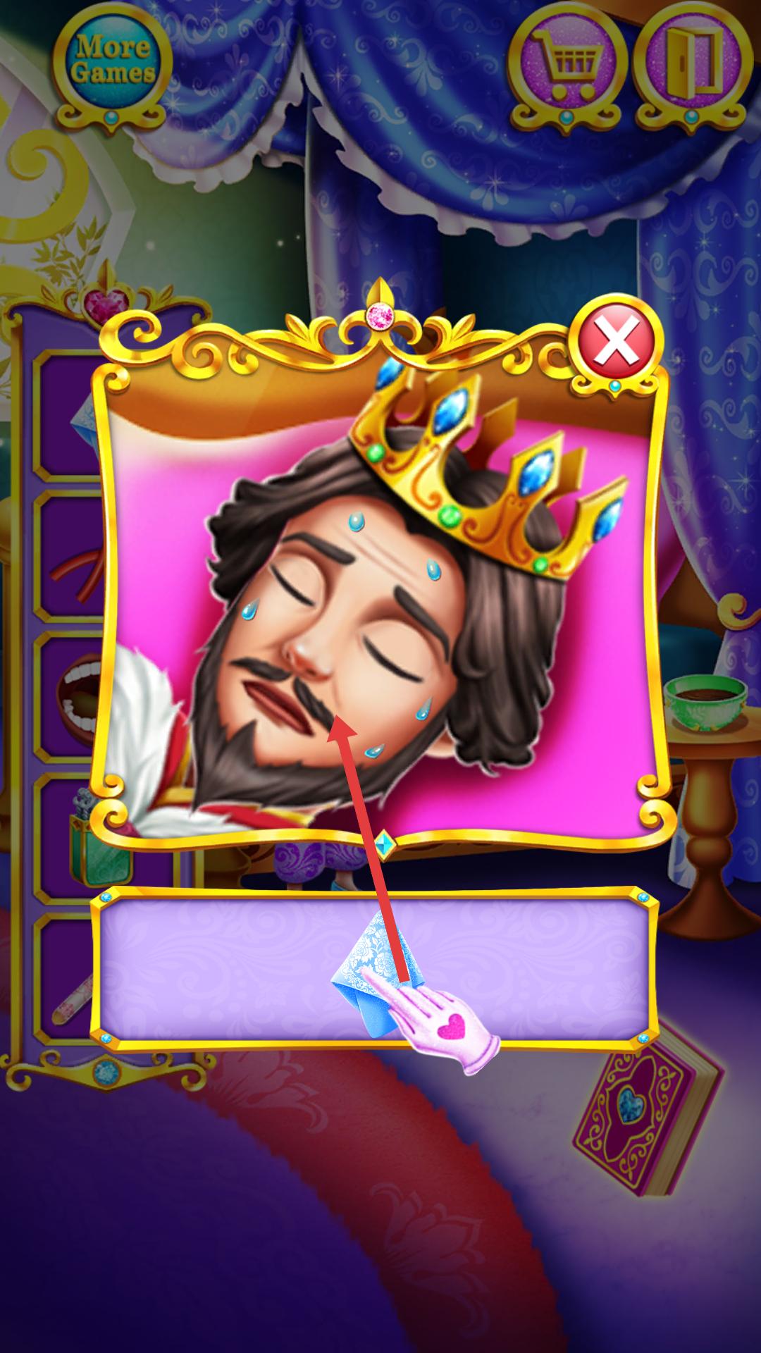 3、選擇合適的道具后,按照提示,將道具用于國王的面部進行擦汗,完成互動推動進程。