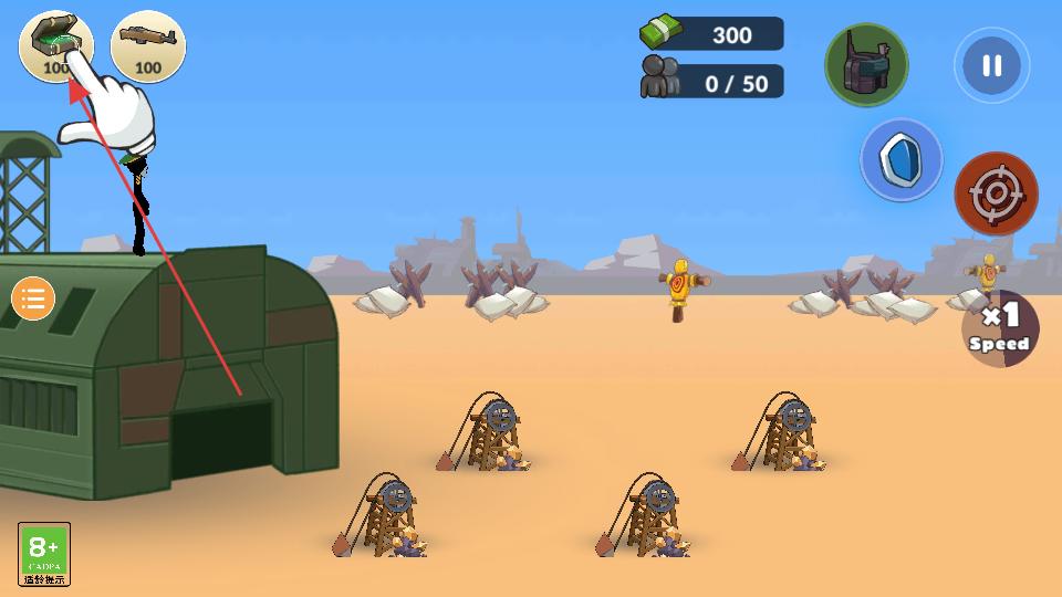 1、進入游戲首先看到界面左上角有寶箱圖標,點擊該圖標可獲取資源,為后續召喚士兵或購買武器等操作提供支持。