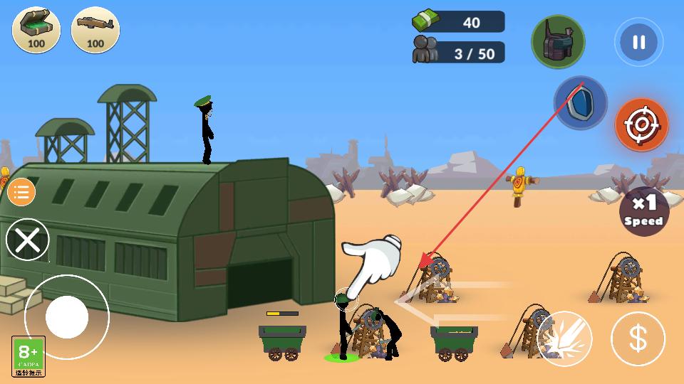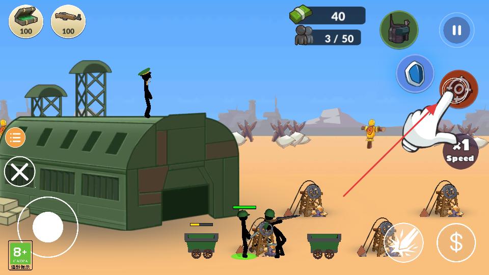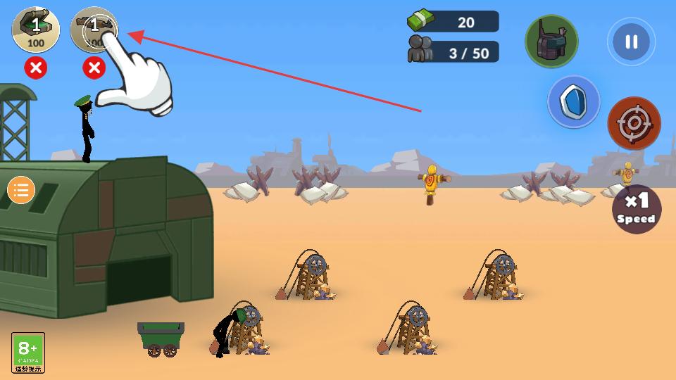 4、當火柴人面臨敵人攻擊時,根據提示火柴人會開啟防御狀態,減少敵人攻擊帶來的傷害,更好地在戰場上存活。