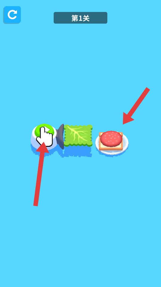 1、游戲第1關,點擊綠色箭頭按鈕,讓食材按順序通過處理區域,完成簡單的食材加工,朝著目標菜品制作推進。