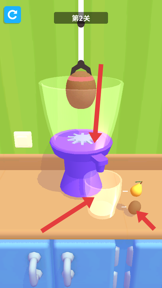 3、在第2關時,操控機器,將懸掛的獼猴桃放入紫色的榨汁機,同時準備好杯子,接收加工后的獼猴桃果汁。