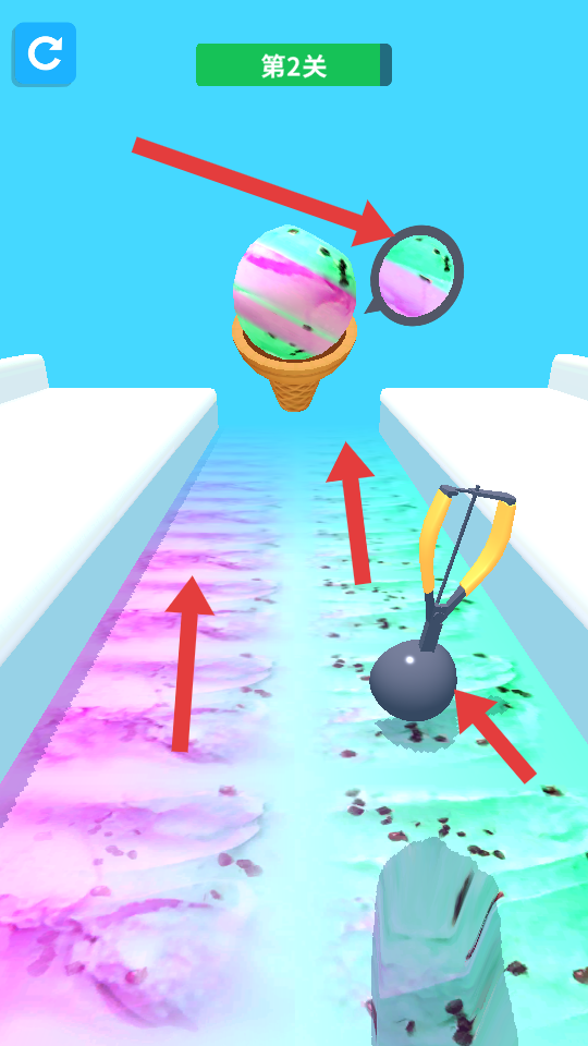 4、用冰淇淋勺收集材料,為冰淇淋球添加對應顏色和配料,讓冰淇淋球符合上方放大鏡顯示的樣式要求。
