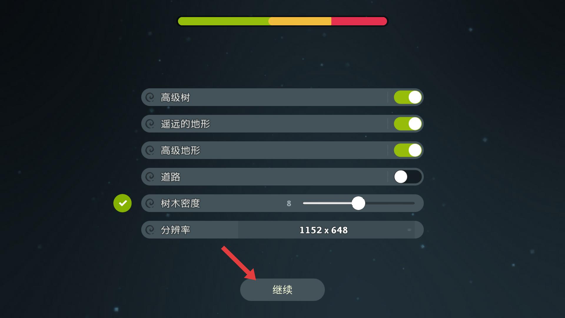 2、在設置界面,按需開啟高級樹、遙遠的地形等選項,調整樹木密度、分辨率,點擊繼續進入游戲場景。