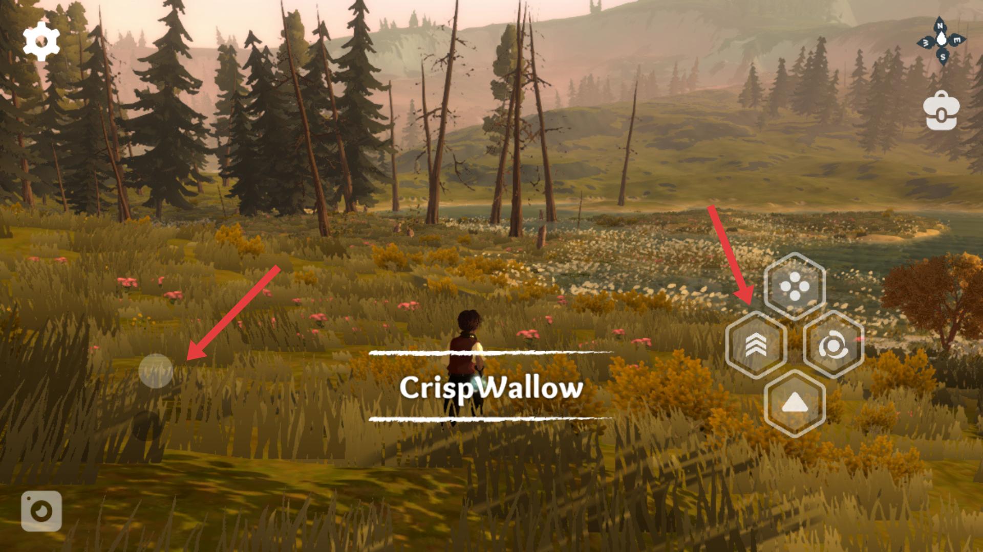 3、進入野外場景,用左側搖桿移動角色,右側按鍵操作功能,探索CrispWallow區域,留意環境互動點,開啟冒險。