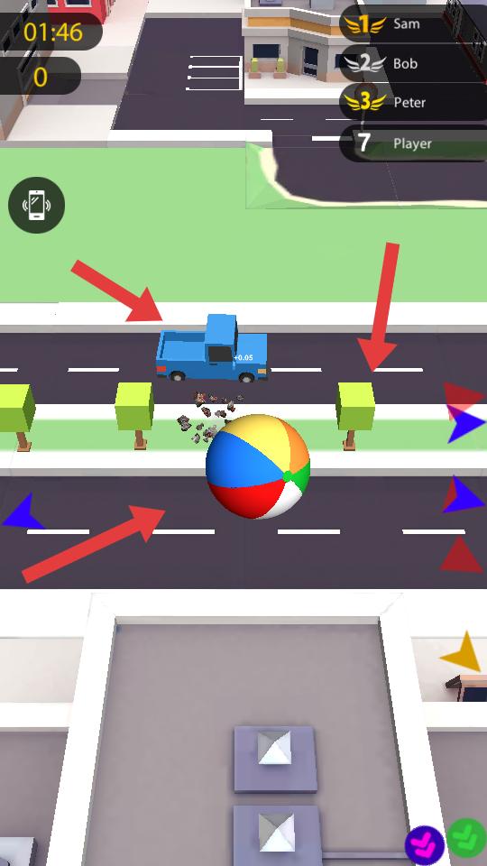 2、游戲場景中操控彩色的破壞球在城市道路上移動,撞擊藍色卡車等物體,造成破壞。