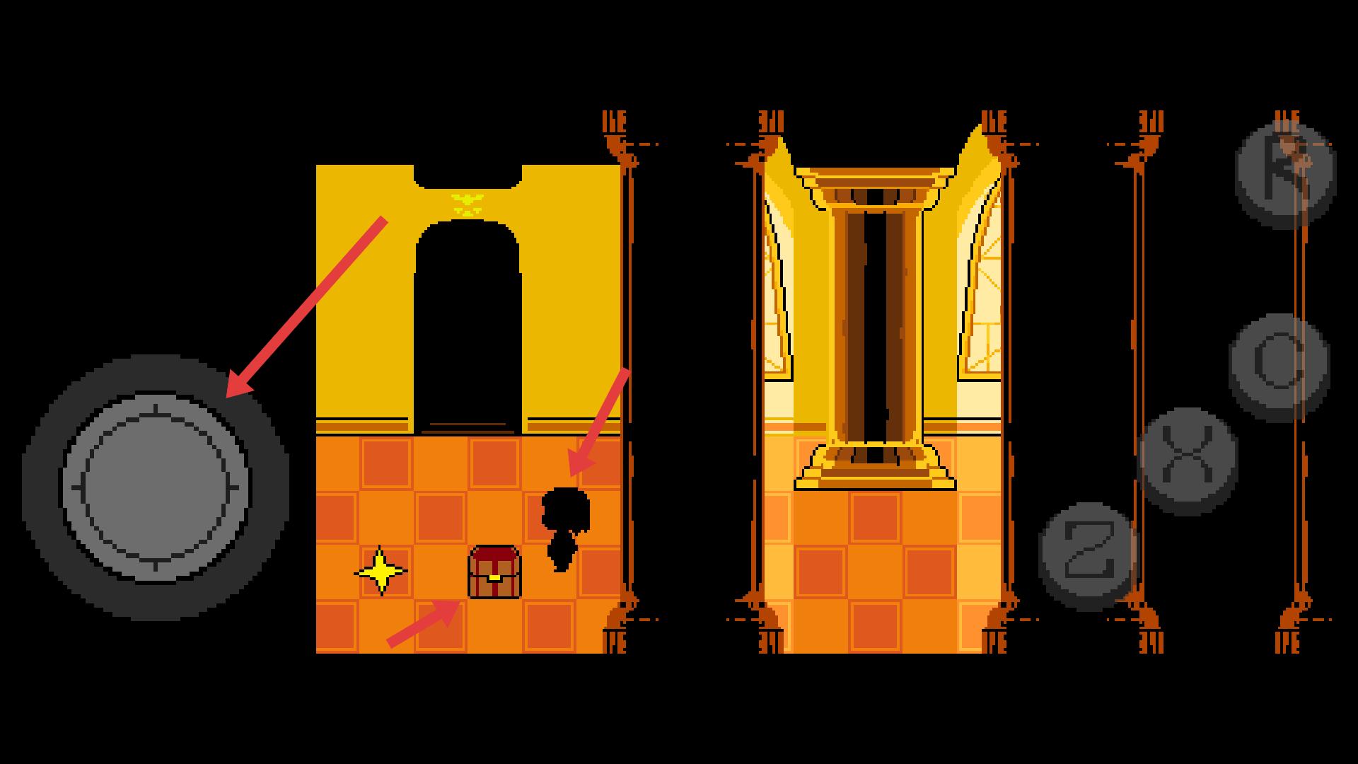2、用左側搖桿控制角色移動,靠近寶箱、星星互動,探索房間,通過拱門進入新區域,收集資源道具。
