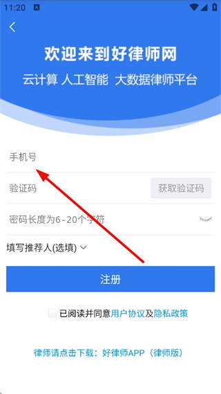 4、若為新用戶可點擊注冊,輸入手機號、獲取并輸入驗證碼,設置密碼同意相關協議后點擊注冊,即可使用好律師網的各項服務。